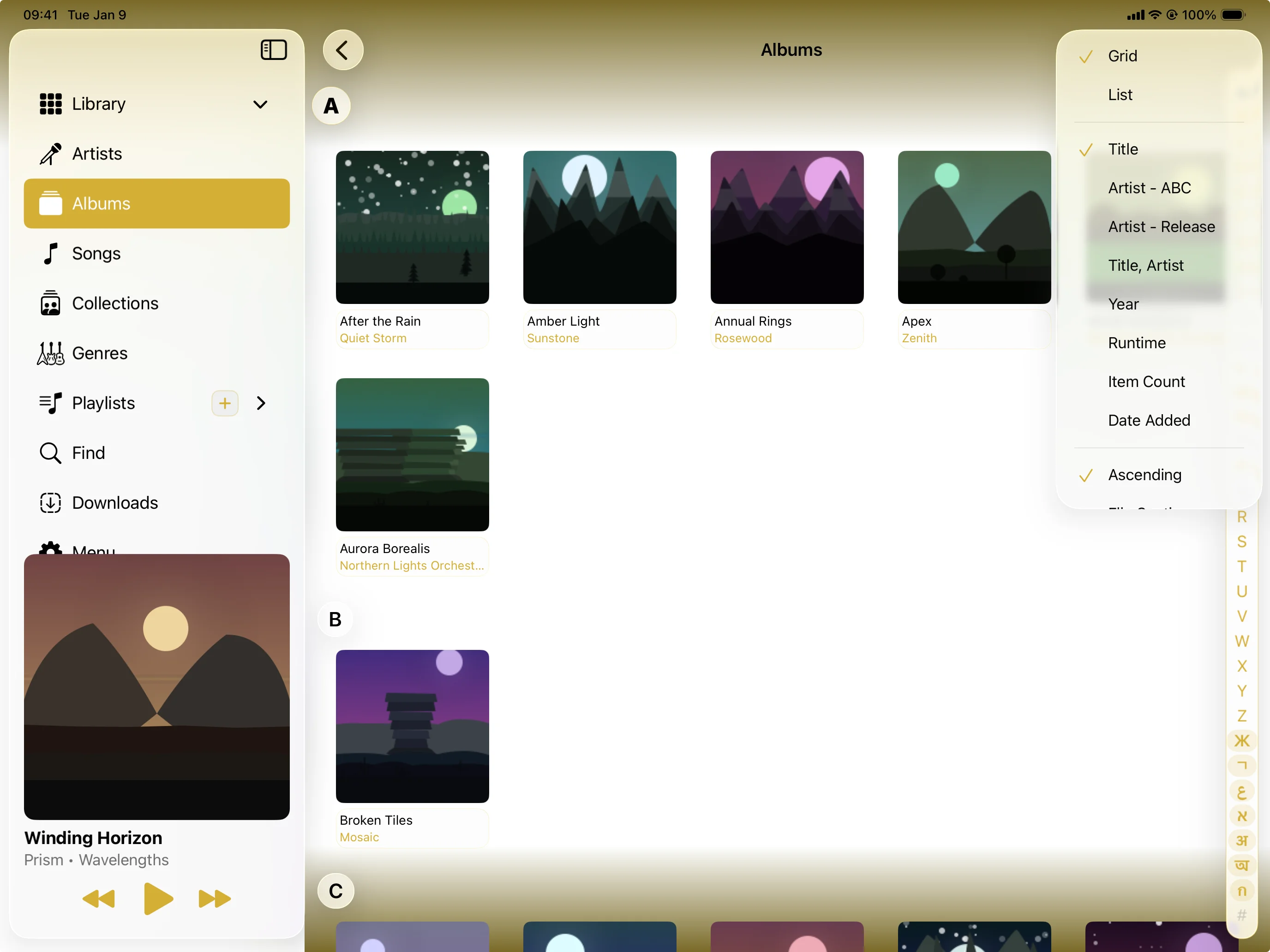 A home screen you shape. Grid-or-list per section. Details that read like liner notes. Queues that survive a reboot. And a single playlist that pulls from every server you're signed into.