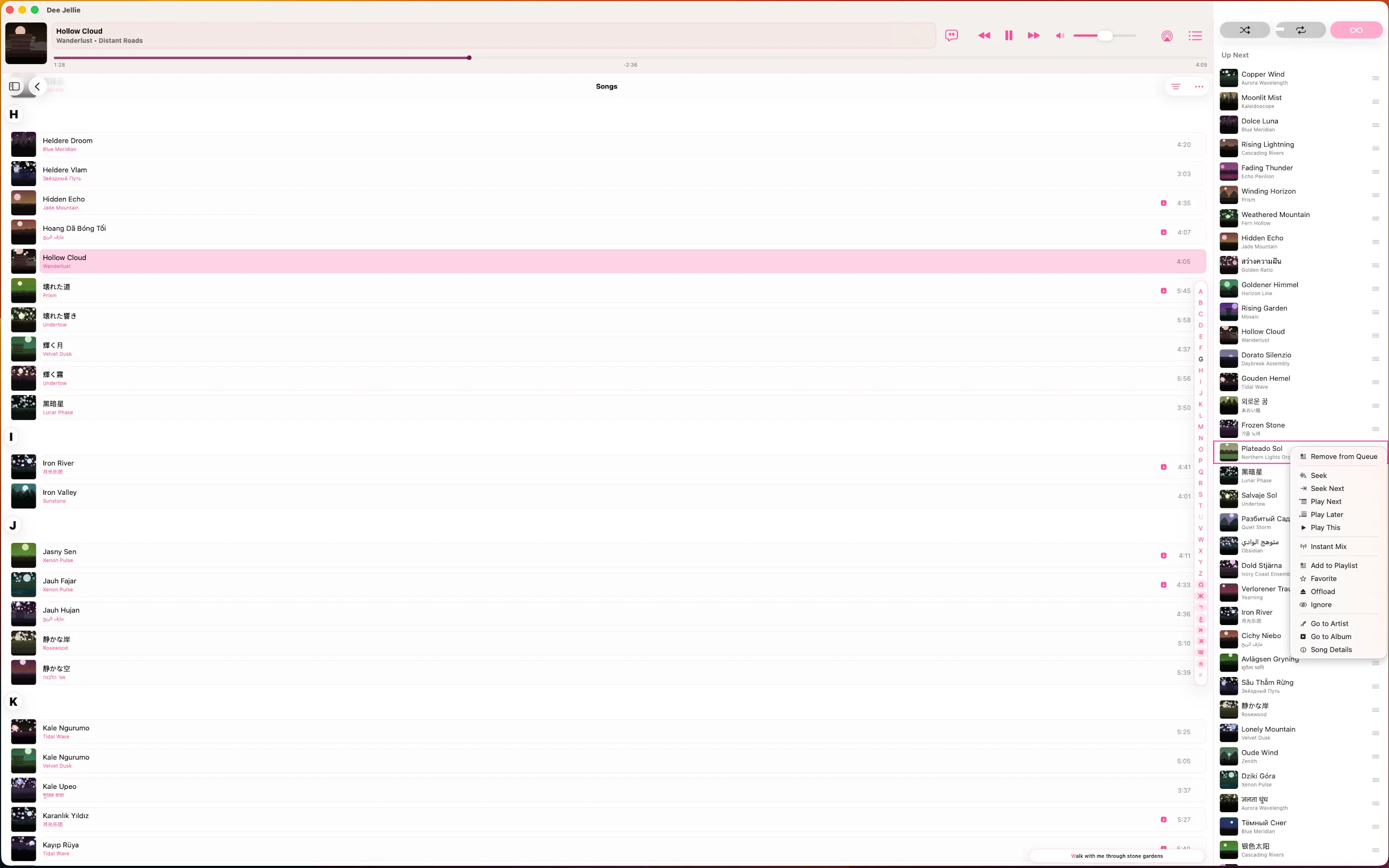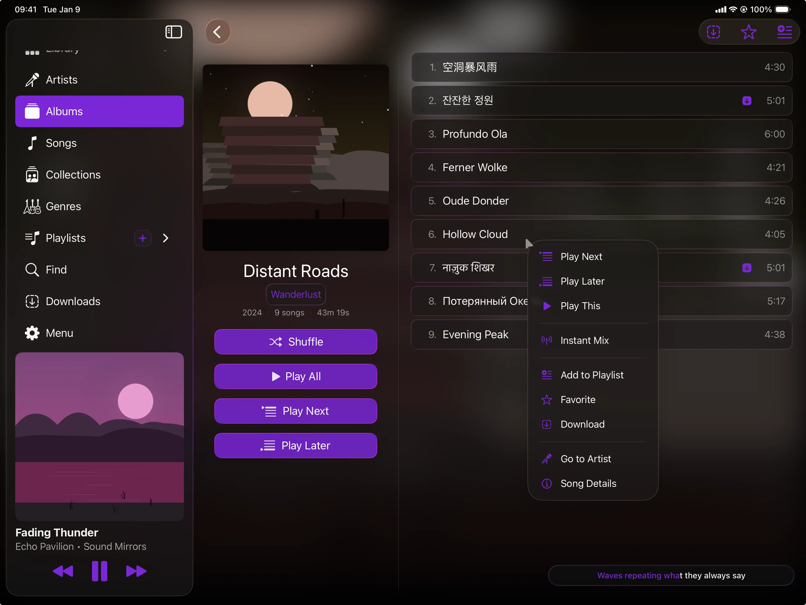 One playlist, songs from everywhere you've signed in. Subsonic out of the box, Jellyfin once you've unlocked Dee Jellie. iCloud syncs it to every device on your Apple ID, and the servers remain blissfully unaware of each other.