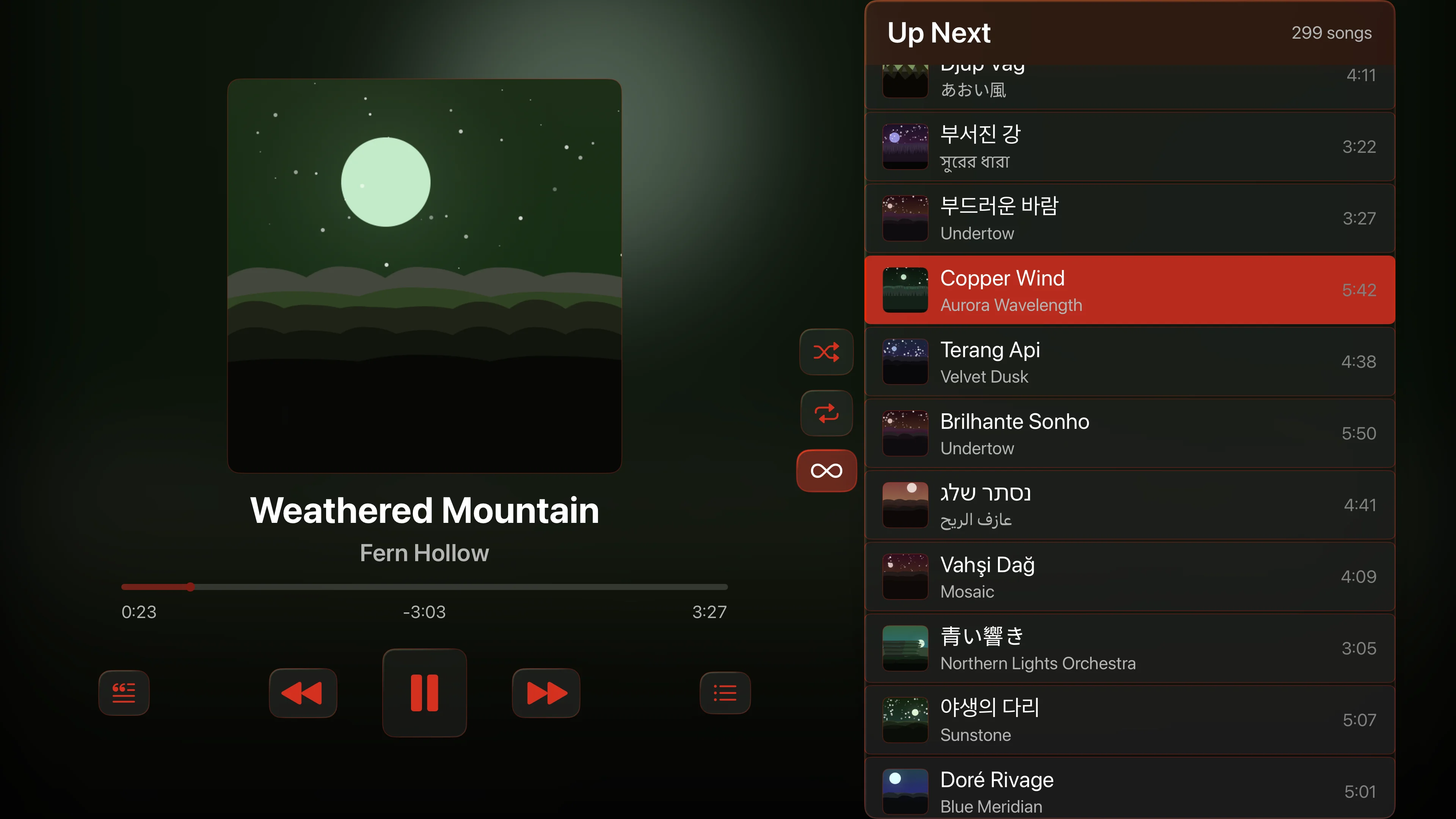 Start a queue on your Apple TV, tweak it from your iPad, rearrange it from your iPhone at dinner. Every device signed into your Apple ID can control whatever's playing on another of your devices: add songs, reorder, seek, all in real time.